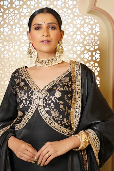 Buy_Monk & Mei By Sonia Anand_Black Organza, Brocade, Silk Sequins, Ghazal Musk Bloom Woven Kurta Pant Set _Online_at_Aza_Fashions