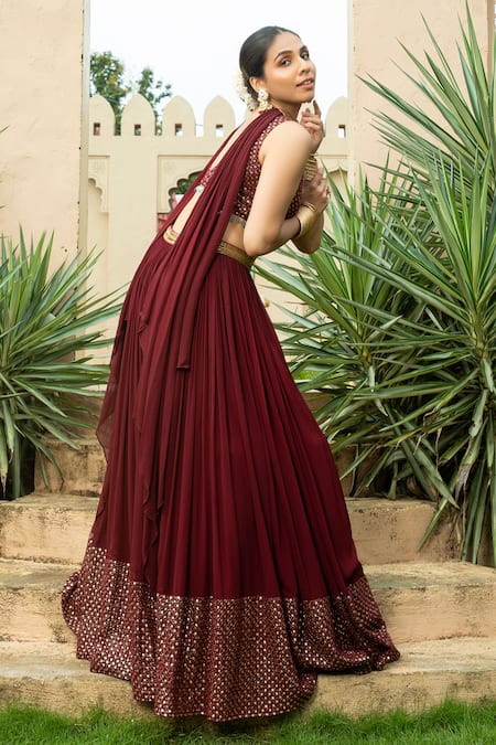 Maroon Georgette Gota Patti, Mirrors V-neck Nadia Embellished Hem Lehenga Set