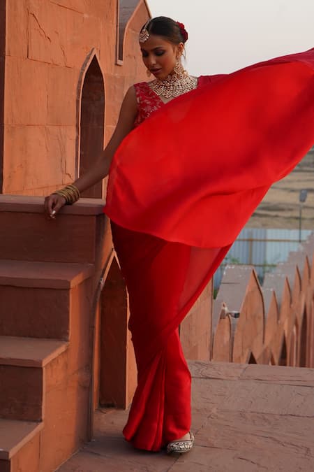 Scarlet red solid pre-draped saree featuring attached inner lining. Paired with a sleeveless plunging V neck brocade blouse with bloom garden woven details & a deep glass back.