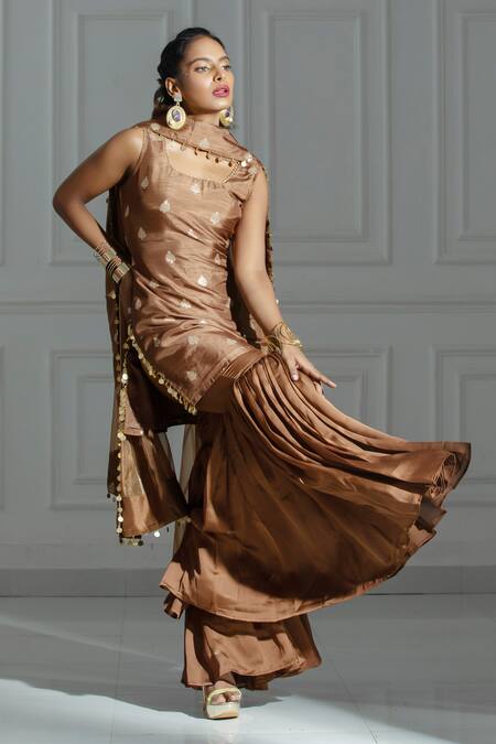 Brown straight kurta featuring an all-over brocade leaf butti pattern. Paired with a flared sharara and a dupatta adorned with coin danglers.