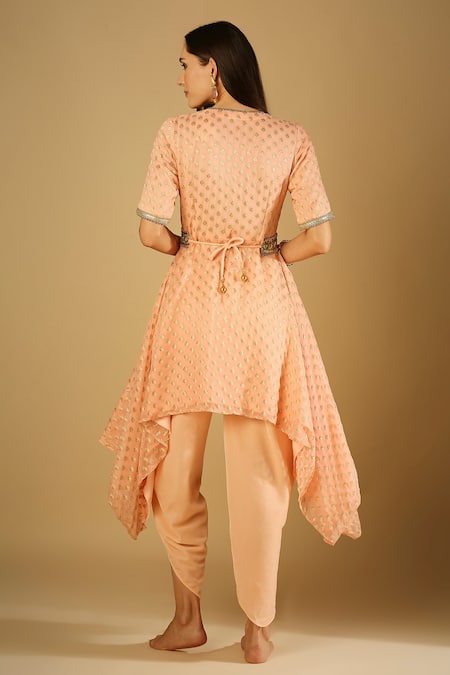 Peach brocade georgette kurta featuring an asymmetric hem and embroidered lace border. Paired with pleated draped dhoti pant and a sequin & zari embroidered belt.