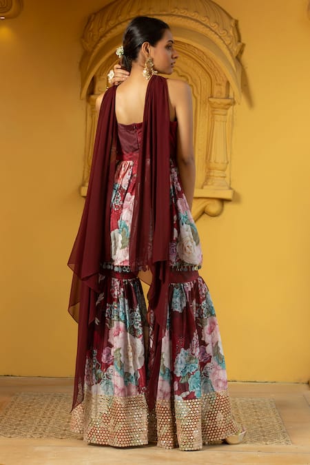Maroon peplum kurta featuring floral print and mirror embellishments. Paired with a matching sharara and dupatta.