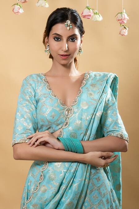 Blue floral brocade pattern blouse featuring a V neck and half sleeves. Paired with a matching floral brocade sharara and dupatta, both adorned with a similar design.