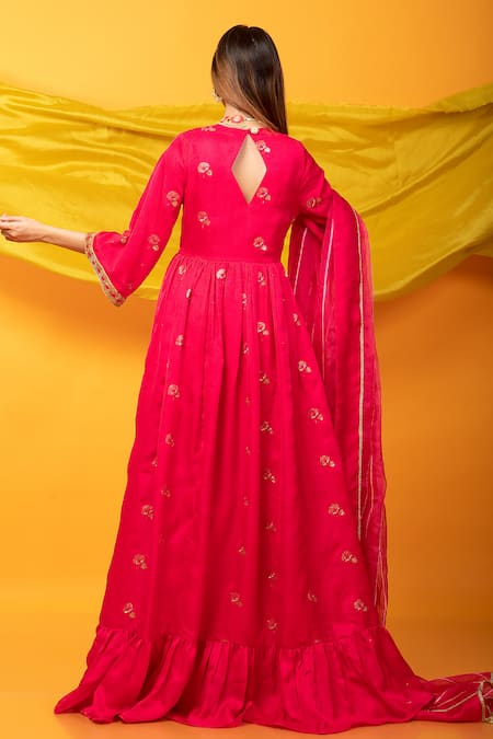 Fuchsia pink silk blend anarkali featuring scattered floral butti embellishments. Paired with a stripe pattern dupatta.