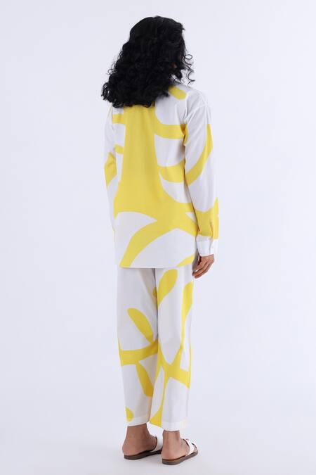 Yellow, white half & half shirt with monstera print & gold rivet detailing on placket.