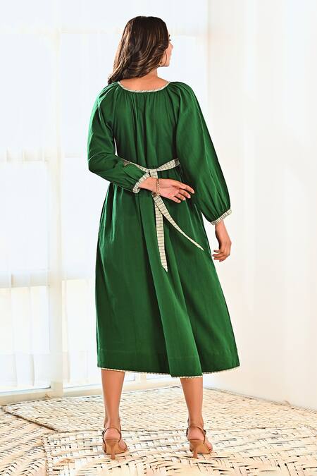Green Cotton Split V-neck Balloon Sleeve Dress