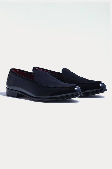 Black almond toe penny loafers crafted in italian suede & patent leather.