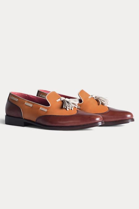 Brown loafers featuring a color block design with a tassel front and stitch line details