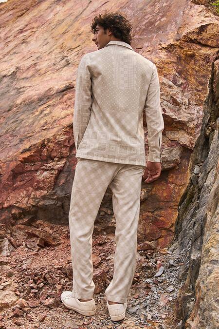 Beige polyester button down shirt with all over Moroccan mosaic tile print, collar & full cuff sleeves. Paired with straight pants with side placement pattern print & side pockets.