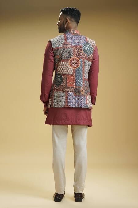 Wine kurta featuring a stand collared neck and full sleeves. Paired with a multi-colored Moroccan pattern bundi jacket and beige trousers.