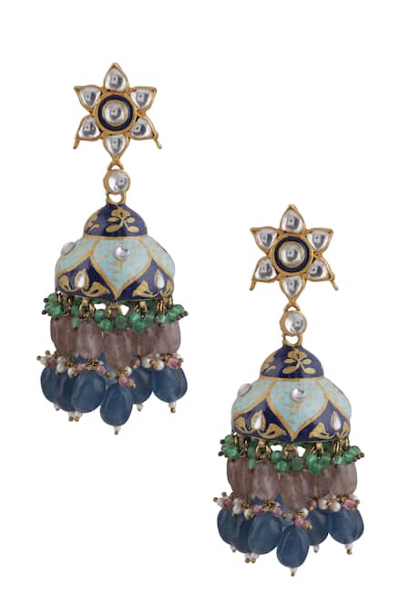 Moroccan pattern jhumkas featuring real jadtar stone and semi precious pearl embellishments