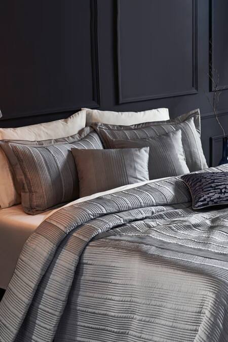 Silver crafted and embroidered silk bedding set includes a bed spread, a deck cover, 2 pillow covers and 2 cushion covers with striped patterns.