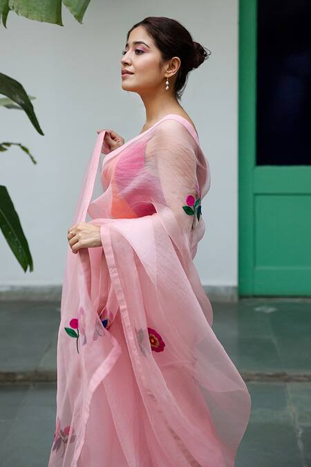 Blush pink silk organza saree with resham thread hand embroidered daisy motifs. Comes with a cotton satin color blocked blouse.
