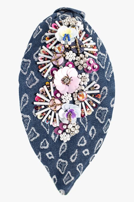 Blue denim hair band featuring geometric print and embroidered flower motifs with sequins, beads, and cutdana