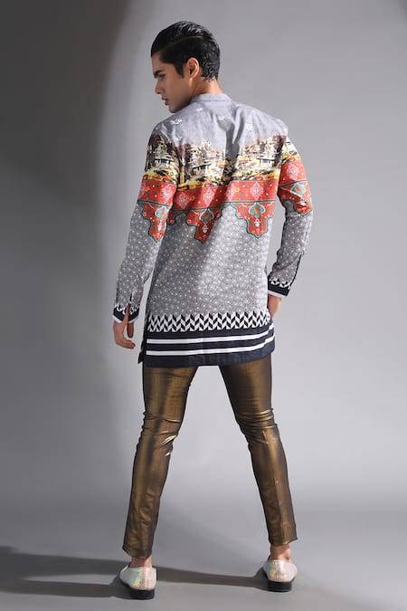 Engineered landscape pattern featuring Benares skyline, Striped hem detail, Front concealed button placket