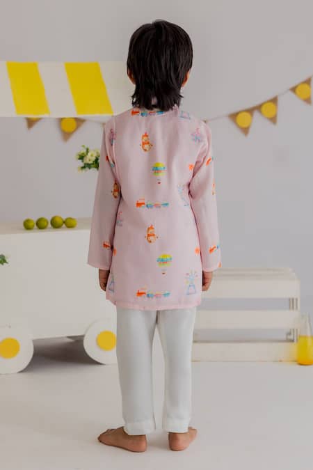 A light pink muslin kurta featuring a carnival print, a band collar, and a partial button placket. It is paired with white cotton pyjamas.