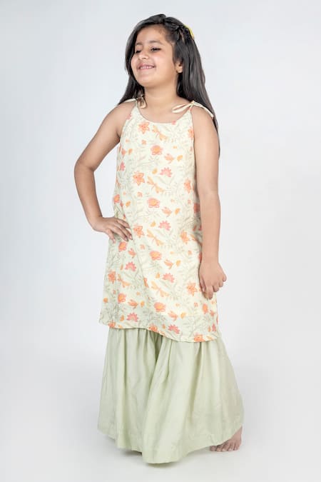 Green Muslin, Linen Digital Print Kurta And Sharara Set