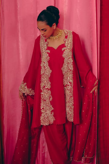 Red Silk Pearls, Zari, Embroidery Adhira Paisley Cutwork Kurta Pant Set