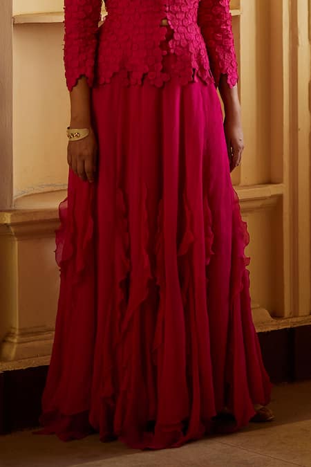 Pink jacket featuring 3D cherry blossom flower embroidery and cutwork hem. Paired with a pink chiffon ruffled skirt and a textured sleeveless blouse.