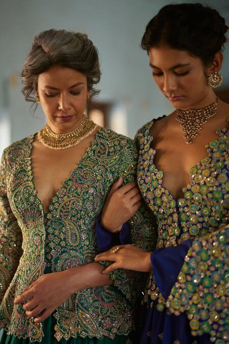 The green lehenga set worn by the other model is not for sale.