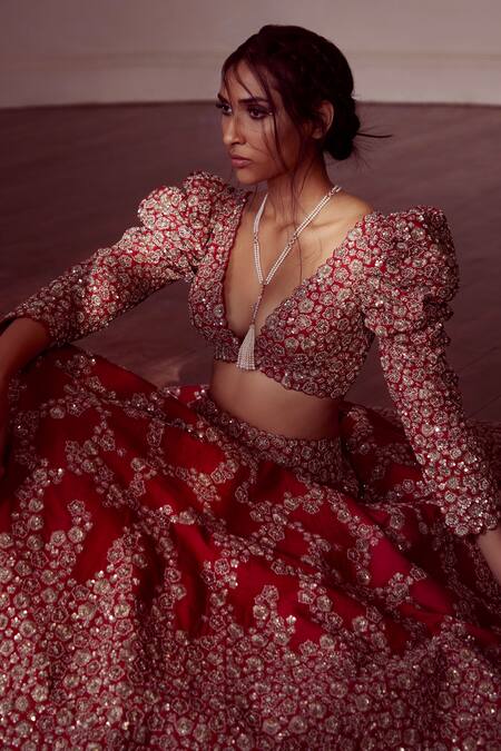 Zardozi embroidered cherry blossoms, Leg o mutton sleeve design, Side zip closure on lehenga