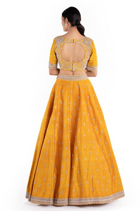 Yellow , Raw U Neck Embroidered Bridal Lehenga Set