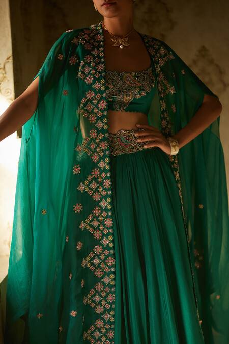 Green embroidered lehenga set featuring a scoop neck blouse with resham and zardozi work. Accompanied by a flowing organza cape with slit sleeves and a high-waisted silk skirt with an embroidered waistband.