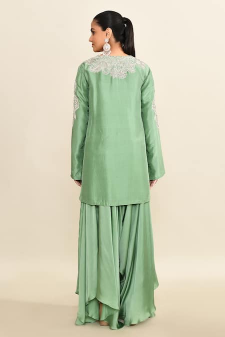 Sage green kurta featuring floral and paisley motif embroidery. Paired with a draped palazzo with side slits.
