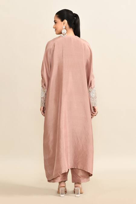 Pink Silk Embroidery V-neck Floral Kaftan And Pant Set