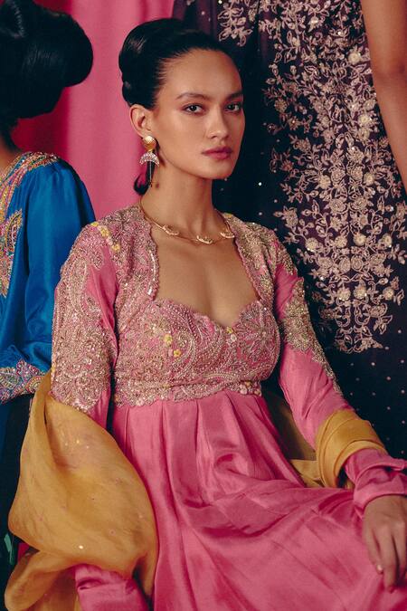 Pink Organza, Silk Pearls, Zari, Floral Yoke Embroidered Anarkali With Dupatta