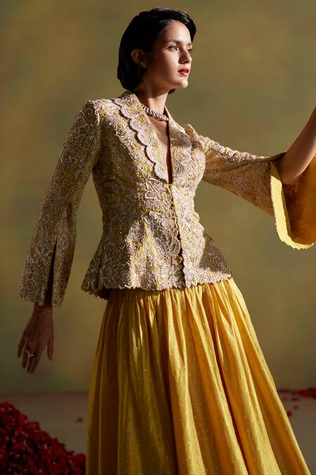 Mustard yellow raw silk peplum jacket featuring floral jaal pattern with zardozi, pearl & ivory resham hand embroidery. Paired with a pure silk gathered skirt adorned with bandhani sequin & ivory hand work.
