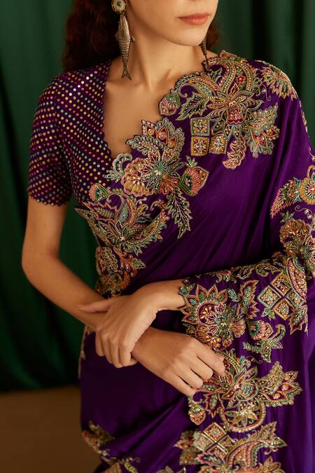 Purple saree featuring paisley and geometric patterns with hand-embroidered multicolor resham, zardozi, and pearls. Paired with a blouse adorned with multicolored sequin and resham embroidery.
