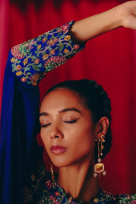 Royal blue kurta featuring multicolor resham, zardozi, and pearl embroidery in a floral pattern. Paired with straight pants for a complete look.