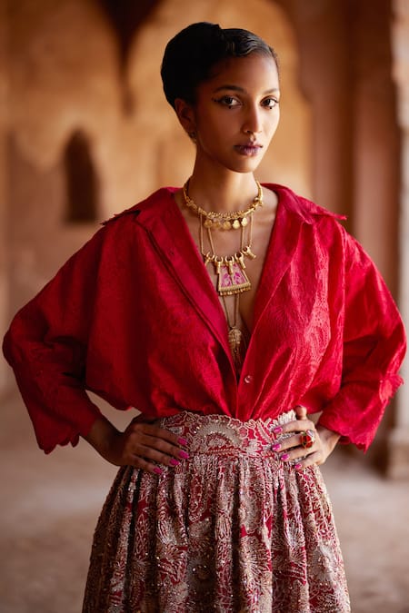 Red Silk Embroidery Collared Manjari Shirt And Lehenga Set