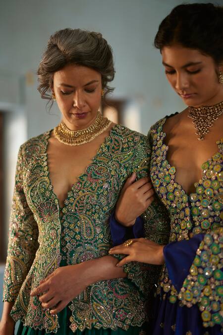 Green lehenga set featuring a plunge V-neck jacket with intricate resham and zardozi embroidery. Paired with a pure silk lehenga adorned with paisley patterns and small buttis.