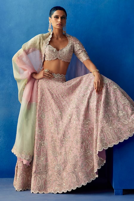 Baby pink lehenga featuring all-over floral jaal pattern with resham & pearl embroidery. Paired with an embroidered padded blouse and a mint & pista green ombre organza dupatta.