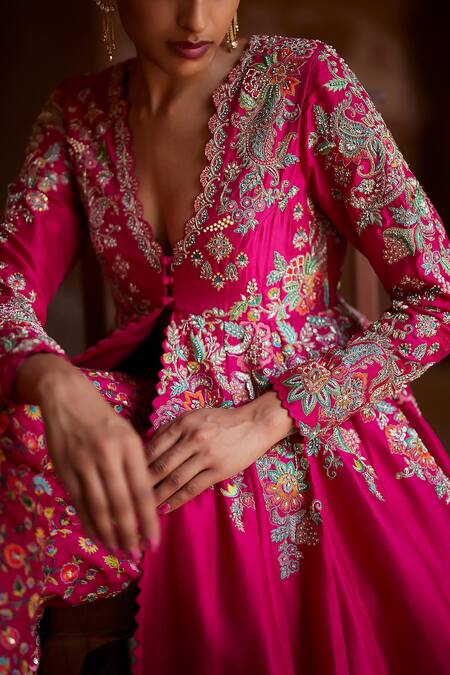 Pink anarkali featuring multi-colored floral resham and zardozi hand embroidery. Paired with a pure silk pink straight pant with resham hand embroidery.