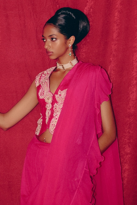 Fuchsia pre-draped saree featuring ruffle detailing and a cutout neck. Paired with a hand-embroidered blouse adorned with multicolored resham, zardozi, and pearls, along with a matching petticoat.