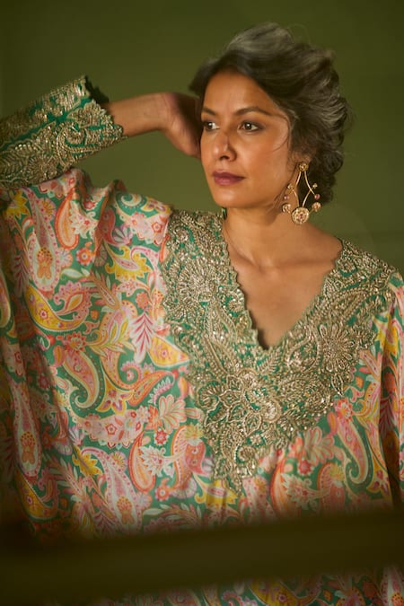 Green Silk Applique, Embroidery V-neck Vintage Print Kaftan And Pant Set