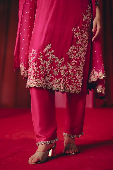 Fuchsia kurta featuring scallop V neck and intricate resham, zardozi, and pearl embroidery. Paired with scallop bordered straight pant and organza dupatta.