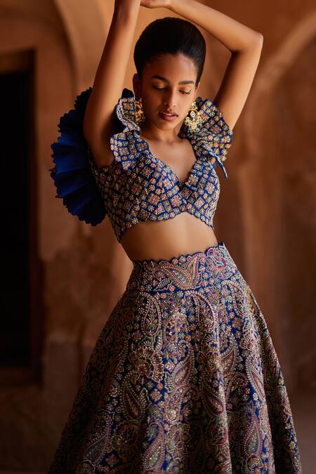Blue Silk Embroidery Sweetheart Neck Tulua Hand Lehenga Set
