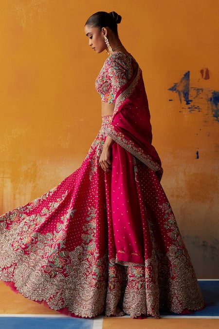 Hot pink lehenga featuring all over resham, zardozi, and sequins embroidery. Paired with a padded blouse with contrast floral resham embroidery and a dupatta with embroidered border.