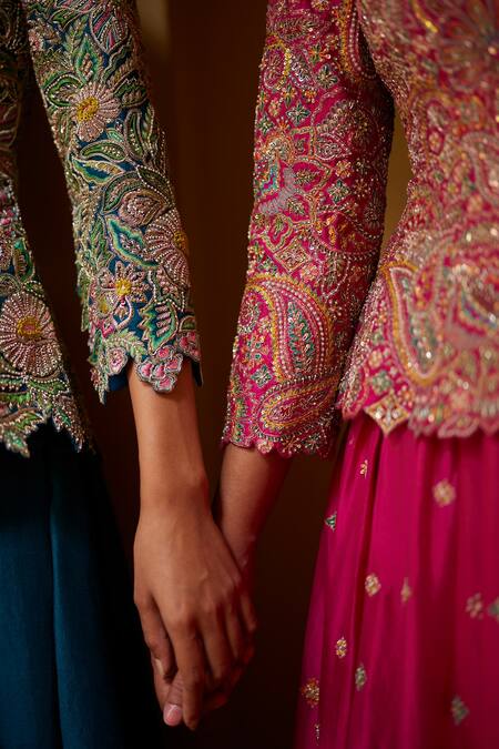 Pink lehenga featuring intricate resham and zardozi embroidery with a paisley pattern border. Accompanied by a matching raw silk peplum jacket with a deep V neck and three-quarter sleeves.