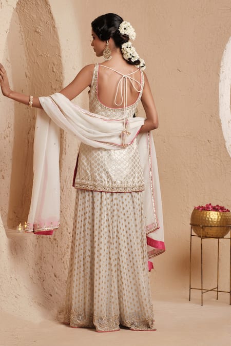 Ivory Kurta featuring hand embroidery with dabka zari. Paired with a matching sharara and organza dupatta.