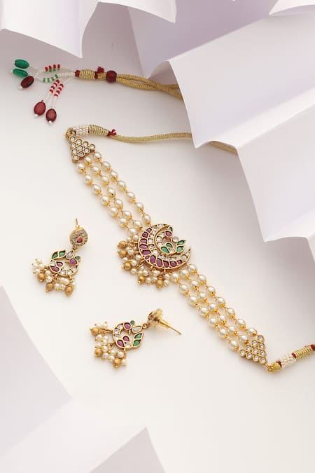 Gold plated crescent moon cutwork choker featuring multi-color stone embellishments and pearl strings. Paired with matching danglers for a complete look.