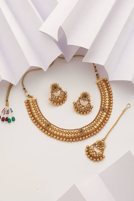 Gold plated floret carved necklace featuring green stone highlights. Paired with crescent moon carved earrings and matching maangtikka.