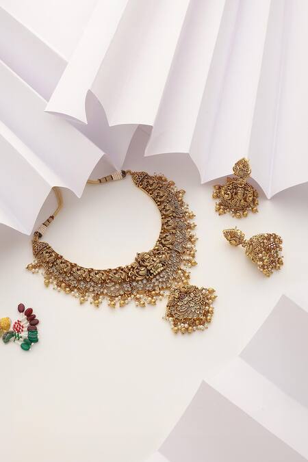 Goddess carved motif in the pendant, Intricate floral cutwork design, Matching jhumka earrings with bead embellishments