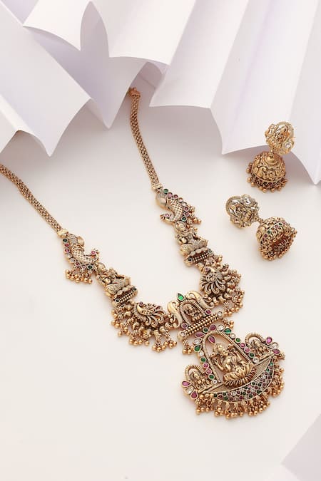 Gold Plated Stones Goddess Lakshmi Carved Pendant Necklace Set
