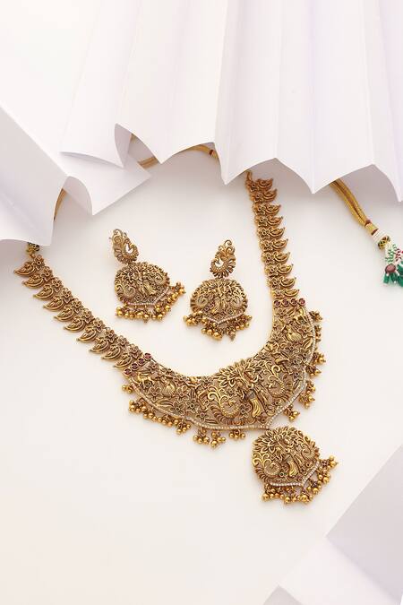 Gold Plated Stones Radha-krishna Carved Long Temple Necklace Set