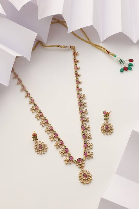 Gold plated temple long necklace featuring red stone studded floral motifs. Paired with matching earrings adorned with similar motifs.